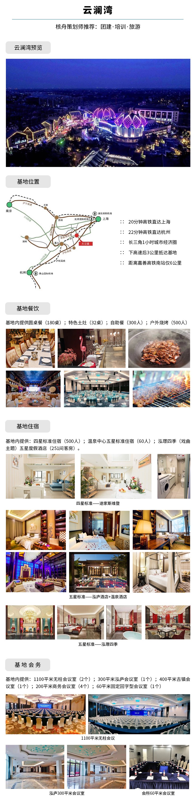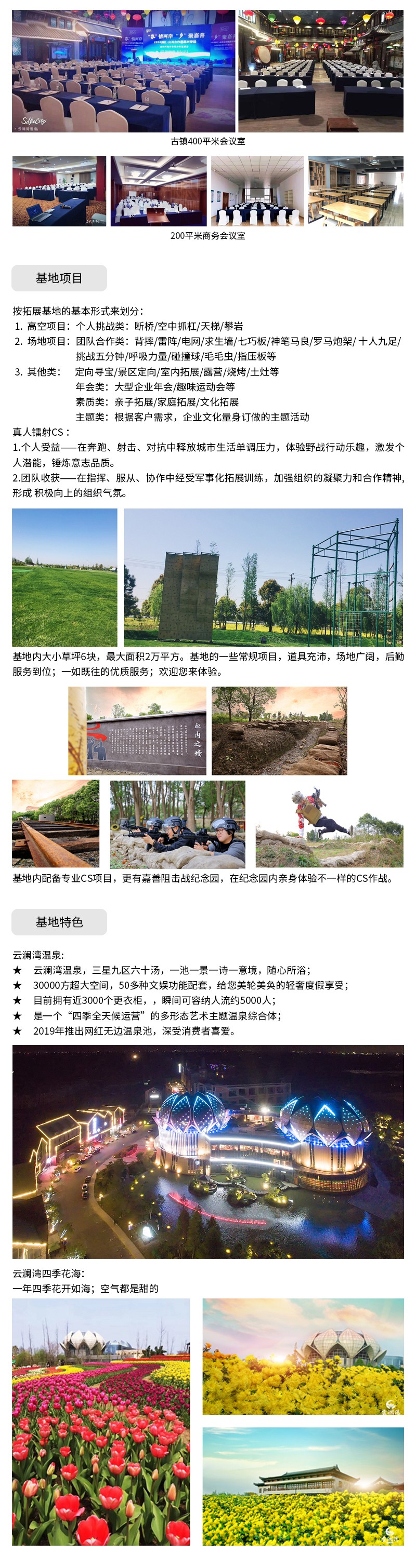 核舟嘉興拓展基地-云瀾灣位于嘉善大云13平方公里省級旅游度假區內,是浙江省內八大持證真溫泉之一,總規劃范圍近1300多畝。“吃、住、行、游、購、娛”無一不有,“商、養、學、閑、情、奇”樣樣皆備,是一個“溫泉中最具有文化特色,景區中最具有養生價值”的綜合性旅游養生度假目的地。設有云瀾灣溫泉、泓廬SPA精品酒店、四季花海樂園、櫻花風情商業街、國際宴會中心、拓展基地、浙江省研學基地等為一體的一站式新型度假勝地。