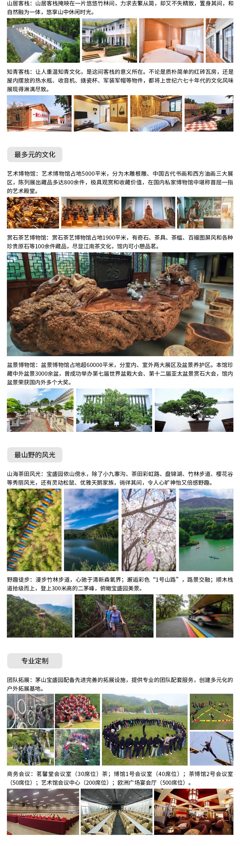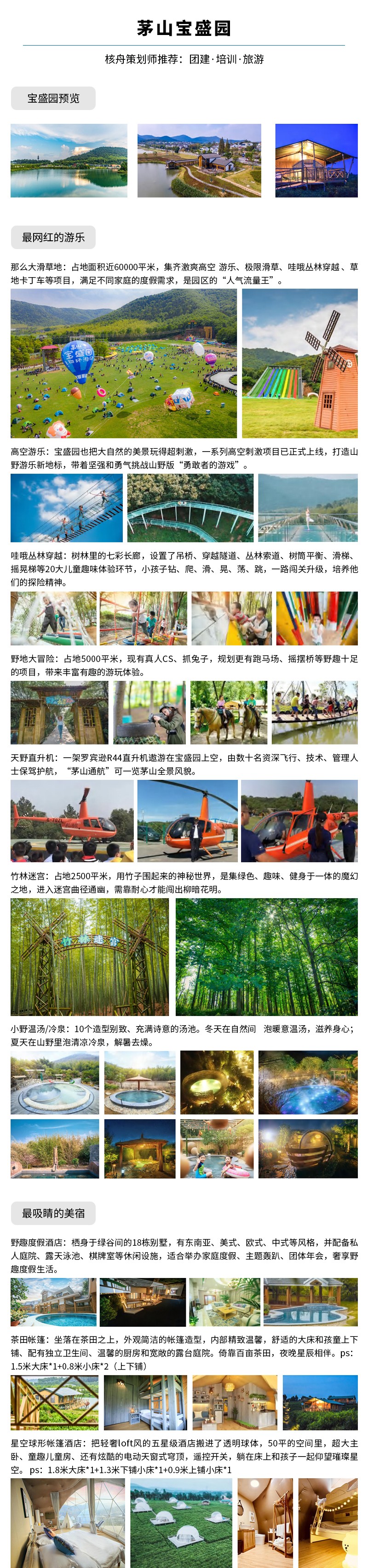 核舟常州團建基地-茅山寶盛園位于風景秀麗的江蘇金壇茅山腳下, 園區總面積3200畝,總投資15億元人民幣,圍繞 “野趣”主題,打造了極限滑草、網紅秋千、天空 步道、茅山叢林漂流等近四十項山野游樂項目,并 規劃有自然藝術、盆景、賞石茶藝、人民防空四大 博物館;野趣度假別墅、星空球形帳篷酒店、茶田 帳篷、山居客棧、知青客棧五大山野美宿;名膳居 山野菜、山野大灶臺、田園燒烤、石鍋飯四大至臻 山野美食。2019年12月小野溫湯/冷泉上線,豐富 了園區季節性體驗,整體形成集“美宿度假、山野 游樂、研學團建、網紅打卡”等為一體的山野度假 游玩勝地,被譽為“藏在山野里的度假樂園”。