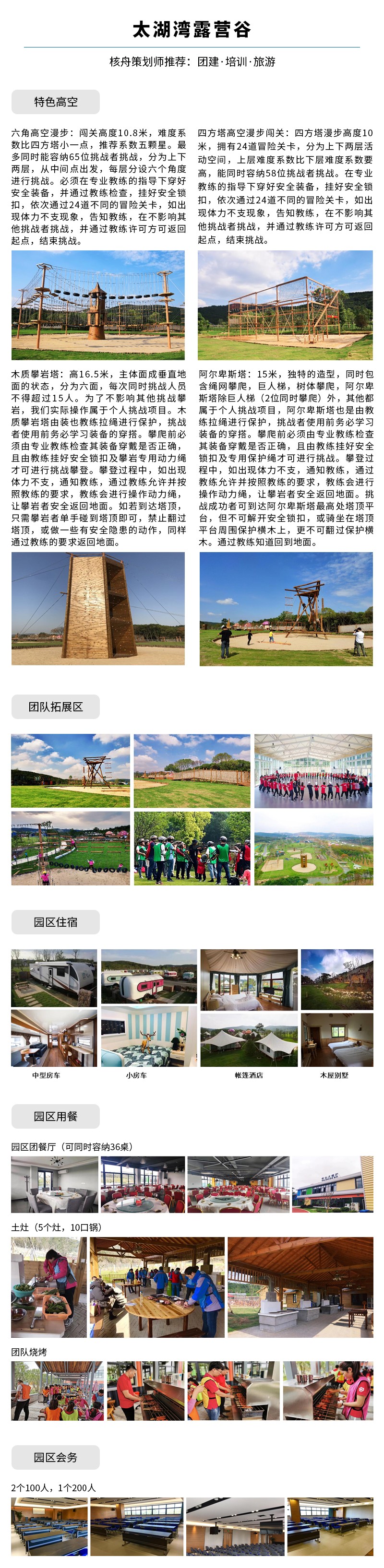 太湖灣露營谷拓展基地,在華東地區業內出類拔萃,其規模大、設施規范、配套完善、綜合性齊全。包括了成人拓展、青少年戶外活動營地、軍事訓練場地、模擬戰場實景的CS基地、風雨長廊和大小不一的多媒體培訓會議室,無論高空設施還是場地環境均按最高標準建設。