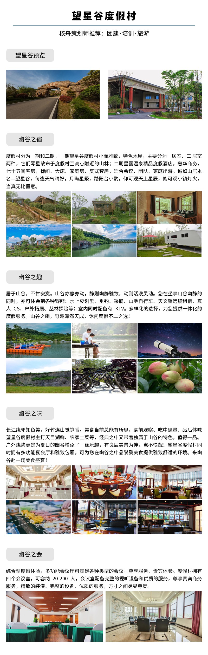 核舟溧陽團建基地—望星谷度假村,鄰近國家5A級旅游度假區(qū)南山竹海與御水溫泉,峰巒疊嶂,碧水  如鏡,青山浮水,倒影翩翩,幽谷之景猶如一副天然畫卷,讓人沉醉其中。度假村占地七百余畝,目前已建成一期和二期,綠色植被面積占比近百分之八十,自然之景與人工點綴相映成趣、相得益彰,最大程度的保留了山谷的原生態(tài)。  村集餐飲、會議、娛樂一體,于打全方位、體化(然、適、回歸自我本真)的休閑度假模式, 足不出戶即可享受幽谷之趣。