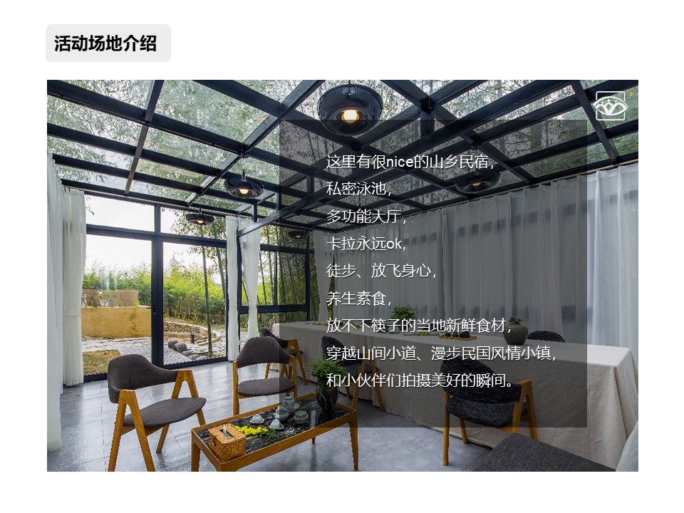 庭院內(nèi)配套活動(dòng)區(qū)域有:多功能大廳、大小會(huì)議區(qū)域3個(gè)(可以容納60人/50人/30人)、泳池、燒烤區(qū)、茶室、陽光餐廳、ktv、桌游、桌球、棋牌室、大草坪等.