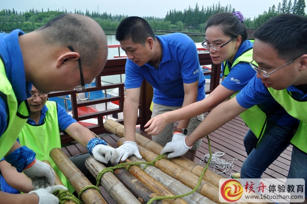 用有限的資料,共同動手制作一艘可以“同舟共濟”的竹筏,共同滑這自己制作的扎筏到湖里去披荊斬浪。