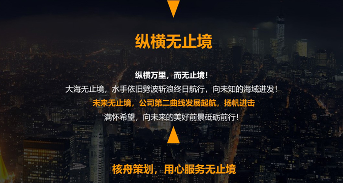 縱橫萬里,而無止境! 大海無止境,水手依舊劈波斬浪終日航行,向未知的海域進發; 未來無止境,公司第二曲線發展起航,揚帆進擊; 滿懷希望,向未來的美好前景砥礪前行。 核舟策劃,用心服務無止境。