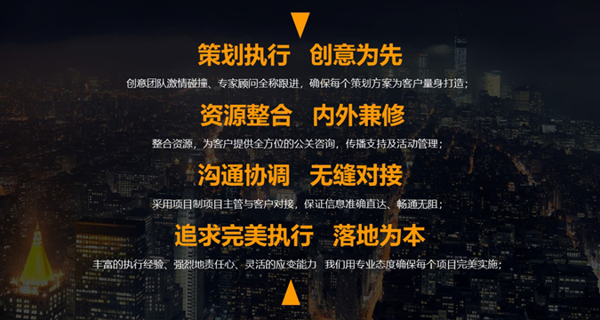策劃執行,創意為先:創意團隊激情碰撞、專家顧問全稱跟進,確保每個策劃方案為客戶量身打造; 資源整合,內外兼修:整合資源,為客戶提供全方位的公關咨詢,傳播支持及活動管理; 溝通協調,無縫對接:采用項目制項目主管與客戶對接,保證信息準確直達、暢通無阻; 追求完美執行,落地為本:豐富的執行經驗、強烈